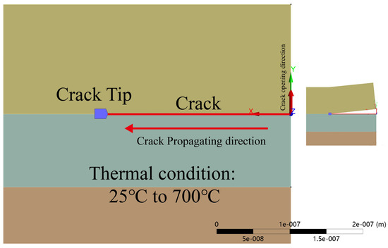 Pre-meshed crack analysis was applied to analyze the fracture toughness of the composite coating system. As shown in Figure 4, a 250 nm-long crack with a depth of 0.5% of the total depth of the coating was placed into the coating model where the highest stress was present and hence the crack was most likely to initiate and propagate. The crack tip was placed right in the nodal at the interface. The origin of the coordinate system for carrying out the crack propagation simulation is anchored at the edge of the interface with the X-axis pointing inwards leading to the crack growing direction.