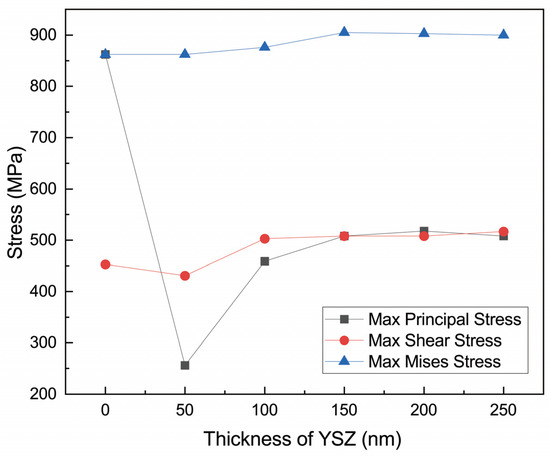 The stress fields of single-layer Al2O3 (150 nm) coating and 8YSZ/Al2O3 (150 nm) nano-thick composite coatings with different thicknesses of 8YSZ interlayers cooling from 700 °C to 25 °C were analyzed. As shown in Figure 5, the max principal stress decreases abruptly from 862 MPa to 256 MPa when 50 nm of the YSZ layer is introduced between the P92 and Al2O3. Then, the max principle stress increases evidently from 250 MPa to about 450 MPa when the thickness of YSZ changes from 50 nm to 100 nm. The further thickness increase of the YSZ layer causes an insignificant rise of the max principle stress and a stress plateau at around 500 MPa appears when the thickness of the YSZ layer increases further from 100 nm to 150 nm. The result indicates that introducing an 8YSZ buffer layer into the P92/Al2O3 coating can greatly reduce the max principal stress owing to its intermediate CTE and good deformability due to its relatively low Young’s modulus and Poisson’s ratio. The shear stress of the coating system decreases slightly from 453 MPa to 431 MPa when the 8YSZ layer with a thickness of 50 nm is placed between the P92 substrate and alumina layer. With the further thickness increase of the 8YSZ layer, the shear stress increases slightly and gradually levels at 500 MPa, which should be caused by the accumulation of the plastic deformation along the circumferential direction of the thicker 8YSZ could result in more stress along the same direction. The max Mises stress remains almost the same at around 850 MPa when the thickness of the 8YSZ interlayer increases, indicating that inserting an 8YSZ interlayer into the P92/Al2O3 imposes an insignificant effect on the total stress or strain if all 3 axes were taken into consideration. Thus, before a crack is initiated, the elastic behavior of the 8YSZ/Al2O3 composite coating and the monolayer Al2O3 coating would be roughly the same.