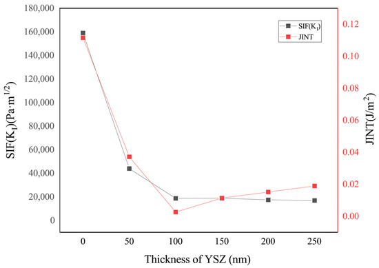 Further analysis of the fracture toughness of single-layer Al2O3 coating and the 8YSZ/Al2O3 composite coating are shown in Figure 8. Both K and J-integral are significantly reduced when the 8YSZ interlayer is inserted. Both two values reach the minimum when the 8YSZ layer with a thickness of 100 nm is inserted. The KI of the 8YSZ (100 nm)/Al2O3 (150 nm) composite coating is calculated to be 6017.9 Pa·m1/2, which is two orders of magnitude lower than that of the mono-layer Al2O3 coating (159 kPa·m1/2). Similarly, the J-integral of the 8YSZ (100 nm)/Al2O3 (150 nm) composite coating is calculated to be 0.0023 J/m2, which is two orders of magnitude lower than that of the single-layer Al2O3 coating, 0.1115 J/m2. When the thickness of the 8YSZ interlayer increases, the KI and J-integral of the coatings remain almost at a similar level. When the thickness of the interlayer is larger than the stress concentration area around the crack tip, the coating boundary would have little impact on the stress intensity of the crack tip. It could be concluded that inserting an 8YSZ buffer layer could greatly improve the fracture resistance of the Al2O3 coating, making it more endurable under thermal cycles.