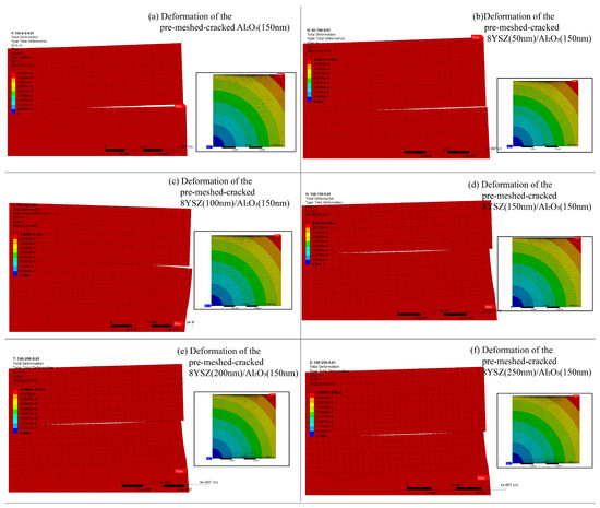 Figure 9. The deformation of the models with pre-meshed crack. (a) Al2O3 (150 nm); (b) 8YSZ (50 nm)/Al2O3 (150 nm); (c) 8YSZ (100 nm)/Al2O3 (150 nm); (d) 8YSZ (150 nm)/Al2O3 (150 nm); (e) 8YSZ (200 nm)/Al2O3 (150 nm); (f) 8YSZ (250 nm)/Al2O3 (150 nm).