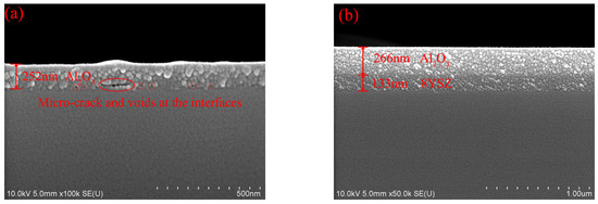 Figure 10. The SEM image of specimens after thermal shock test. (a) P92/Al2O3 (252 nm); (b) P92/8YSZ (155 nm)/Al2O3 (266 nm).