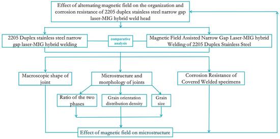The addition of a magnetic field changes the distribution of the weld heat source, which affects the organization and properties [29]. Studies related to alternating magnetic fields are rare, and the use of magnetic field effects to improve organization and properties is valuable. In this study, 25 mm thick 2205 duplex stainless steel is selected as the base material, and an alternating magnetic field parallel to the weld is applied to narrow-gap laser-MIG hybrid welding. The effects of the alternating magnetic field on the two-phase equilibrium of the weld tissue, the distribution of the texture, the grain orientation, and the grain size are discussed via OM, EBSD, and TEM [30]. To elucidate the mechanism of the tissue structure transformation under the effect of alternating magnetic fields [31], we analyze the effect of an alternating magnetic field on the corrosion resistance of 2205 duplex stainless steel welded joints with narrow-gap laser arc hybrid welding through electrochemical tests. The effect of the alternating magnetic field on the organization characteristics and corrosion resistance of laser-MIG hybrid welded joints of duplex stainless steel is illustrated according to the test results. The roadmap for the paper is shown in Figure 1.