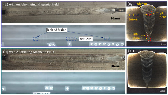 Welded joint forming and macroscopic morphology: (a,a1) without alternating magnetic field; (b,b1) with alternating magnetic field.