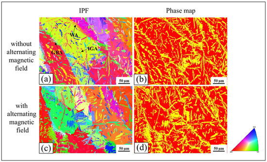 EBSD phase maps and IPFs in the RD direction of the cosmetic bead: (a,b) without alternating magnetic field; (c,d) with alternating magnetic field.