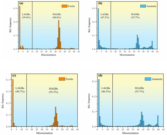 Misorientation angle distribution of grain boundaries of the cosmetic bead: (a) Ferrite without alternating magnetic field; (b) Austenite without alternating magnetic field; (c) Ferrite without alternating magnetic field; (d) Austenite without alternating magnetic field.