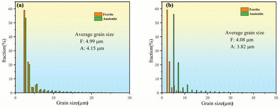 Figure 7 shows the distribution of the grain boundary orientation difference between the two phases of the cosmetic bead with and without the effect of an alternating magnetic field. Without the effect of alternating magnetic fields, the ferrite phase contains 39.4% LAGBs, 60.6% HAGBs, and the twinned grain boundary is 1.82%. The austenite phase contains 52.7% HAGBs and 3.0% twin boundaries, at which time the grain orientation is easily changed in favor of the Goss texture. After the application of an alternating magnetic field, the HAGBs in the ferrite phase decrease to 44.7%, and the HAGBs in the austenitic phase increase. The effect of the alternating magnetic field impacts the dislocation climbing within the ferrite and reduces the laminar dislocation energy. The action on the austenitic phase favors the formation of twins, increases the grain boundary transition potential, and raises the possibility of a grain orientation change. As a result of the analysis of the contrast pole figure, the austenite grains are transferred from the Goss texture to the Copper texture. The grain size distribution of the two phases of the weld with and without the assistance of the alternating magnetic field is shown in Figure 8. The average grain size of the ferrite phase of the weld without an alternating magnetic field is 4.99 μm, and the average grain size of the austenite phase is 4.15 μm. After the application of the alternating magnetic field, the ferrite phase and the austenite phase are affected by electromagnetic stirring, and the average sizes of the grains of the two phases become smaller, with the ferrite phase decreasing to 4.08 μm, and the austenite phase decreasing to 3.82 μm. It is worth mentioning that the grain refinement increases the weld toughness. The refinement of austenite and the increase in austenite content in the cover organization play a very important role in the improvement of corrosion resistance.