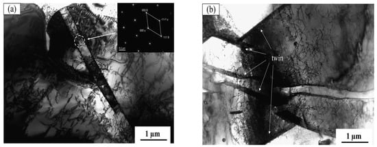 Figure 9 shows the TEM and SEAD with and without a magnetic field. Figure 9a shows the TEM photographs of the weld with no alternating magnetic field, and the twinned organization with elongated lamellar structure throughout the grain is observed within the austenitic organization. Figure 9b shows the TEM pictures of the weld after the introduction of the magnetic field. After the introduction of an alternating magnetic field, the twin density is increased to some extent, which leads to a texture transition when the density reaches a certain level. As a result, twin crystals are more easily formed with the assistance of the alternating magnetic field, and the possibility of grain orientation change is increased.