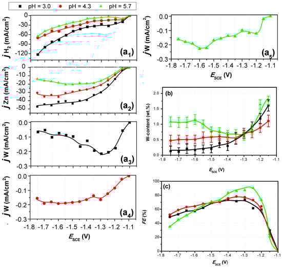 The steady-state partial polarization curves of co-discharge of Zn(II), W(VI) and hydrogen are drawn in Figure 2a1–a5, in comparison with the dependence of both the W-content in the deposit (Figure 2b) and the faradaic efficiency of the applied deposition potential (Figure 2c). It is evident that, for all three pH values, the codeposition of W with Zn (Figure 2a3–a5) takes place within the whole range of applied potential, i.e., from −1.15 V vs. SCE to −1.75 V vs. SCE.
