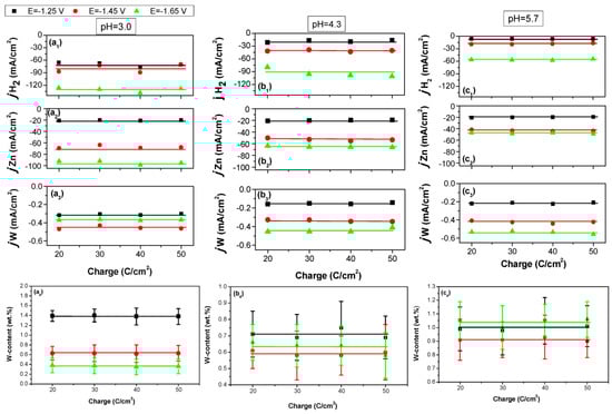It is evident that the deposition processes are stable through the whole range of applied charge, in all studied cases (Figure 4a1–c3). Consequently, the concentration of W is constant through the cross-section of the deposited layers (Figure 4a4,b4,c4). This was confirmed by EDS analysis of coating cross-sections (Figures S1 and S2 in Supplementary Materials). Hence, it can be concluded that our Zn–W deposition process is stable, and that W codeposition proceeds invariably with Zn deposition.