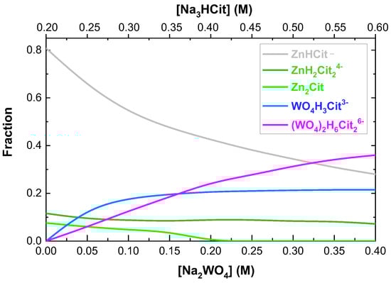 To analyze the stability of the Zn(II)–W(VI)–citrate system, a thermodynamic model of species distribution was made based on the stability constants of the species [,,]. The calculations were made using HYDRA and MEDUSA programs [].