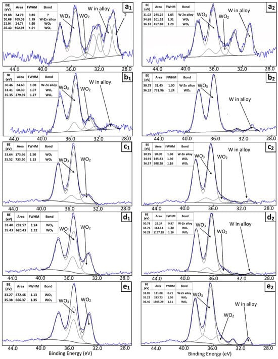 High-resolution XPS spectra of W4f core level with deconvolution on the component peaks obtained before (a1–e1) and after (a2–e2) ion sputtering. Zn–W layers deposited from baths with three different pH values and three deposition potentials. Electrolyte solution composition: 0.40 M Na3HCit, 0.20 M ZnSO4, 0.20 M Na2WO4. ω = 2000 rpm, Q = 20 C/cm2, T = 25 °C, Cu substrate. (a1,a2) pH = 3.0, E = −1.25 V vs. SCE, (b1,b2) pH = 4.3, E = −1.25 V vs. SCE, (c1,c2) pH = 5.7, E = −1.25 V vs. SCE, (d1,d2) pH = 5.7, E = −1.45 V vs. SCE, (e1,e2) pH = 5.7, E = −1.65 V vs. SCE.