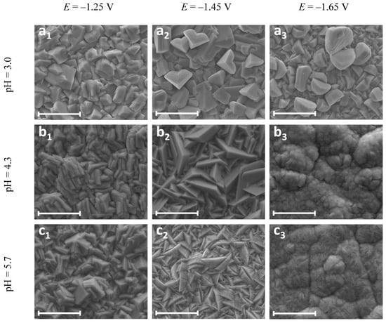 SEM secondary electrons (SE) images of Zn–W coatings with various W-contents, deposited at three applied potentials from electrolytes with three different pH values on a Cu substrate. Electrolyte solution composition: 0.30 M Na3HCit, 0.20 M ZnSO4, 0.10 M Na2WO4. ω = 250 rpm, Q = 20 C/cm2, T = 25 °C. (a1) 0.91 ± 0.14 wt.% W, (a2) 0.38 ± 0.13 wt.% W, (a3) 0.21 ± 0.13 wt.%, (b1) 0.74 ± 0.17 wt.% W, (b2) 0.60 ± 0.13 wt.% W, (b3) 0.51 ± 0.14 wt.% W, (c1) 0.83 ± 0.16 wt.% W, (c2) 0.78 ± 0.12 wt.% W, (c3) 1.1 wt.% ± 0.17 wt.% W. Scale bars equal 10 μm.
