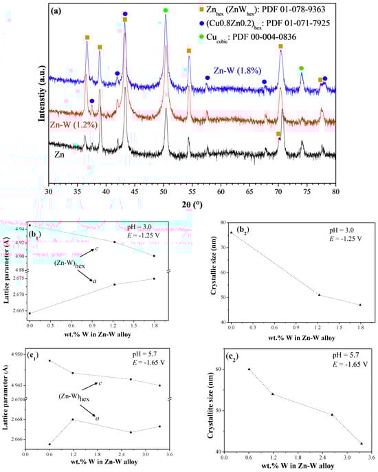 XRD characterization of Zn–W layers was carried out at room temperature immediately after deposition, for two sets of samples with varying tungsten contents (Figure 10). XRD did not detect the presence of either tungsten oxides or pure metallic W. Three phases appear in all XRD patterns: hexagonal Zn–W phase resulting from the substitution of Zn atoms by W atoms in the Zn crystal lattice, cubic Cu–Zn around the coating/Cu-substrate interface due to diffusion processes, and cubic Cu phase of the Cu substrate (Figure 10a). Substitutional W atoms cause changes in the unit cell parameters; lattice parameter c decreases while lattice parameter a increases when the W-content in the deposits increases (Figure 10b1,c1). The cause of these changes is the higher atomic radius of W compared to Zn (1.93 Å vs. 1.42 Å []) and the formation of a Zn–W hexagonal phase. This characteristic change in lattice parameters is much more significant in the case of Zn–W layers deposited at –1.25 V vs. SCE from a bath with pH = 3.0 (Figure 10b1) compared to layers deposited at –1.65 V vs. SCE from a bath with pH = 5.7 (Figure 10c1). This finding is in line with the XPS results showing that the Zn–W layers formed in a bath with pH = 3.0 contain a much higher amount of tungsten in metallic form (Figure 7a1,a2) than the other Zn–W layers, including those deposited from a bath with pH = 5.7 (Figure 7b1–e2). Furthermore, a decrease in the Zn–W crystallite size is observed with the increase in the W-content (Figure 10b2,c2). This is considered advantageous for corrosion resistance, due to a higher grain boundary density on the surface of fine-grained coatings in comparison with coarse-grained layers [].