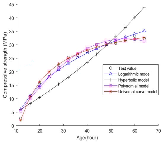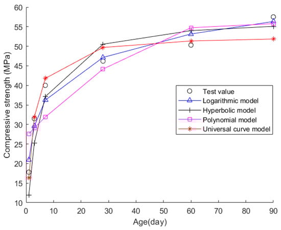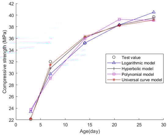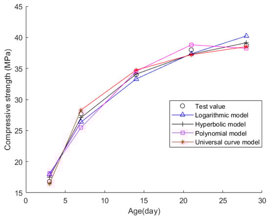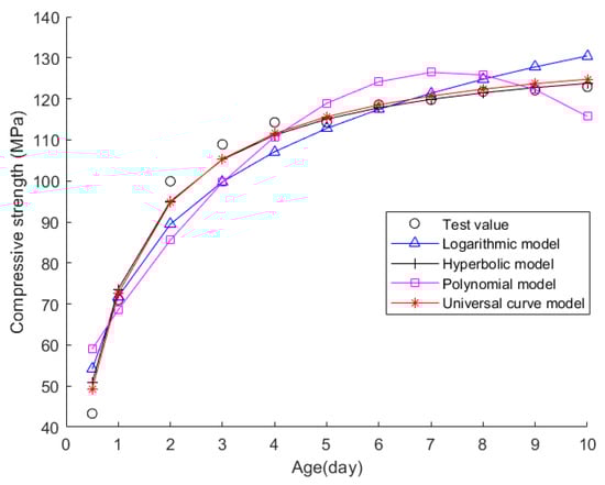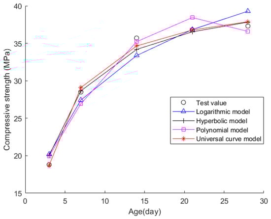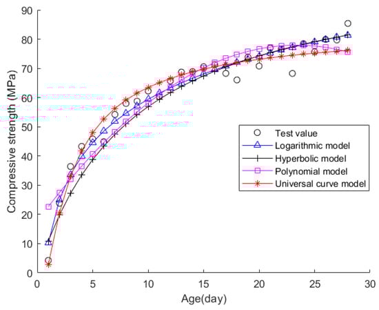 36] obtained the compressive strength of ordinary Portland concrete at 1 to 28 days via concrete compressive strength experiments and fitted the obtained data using a cubic polynomial model to obtain a fitting curve of concrete compressive strength over time. Yeh [