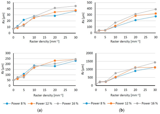 Dependence of roughness parameters Ra and Rz on laser raster density in engraved wood surfaces at laser power vales of 8, 12 and 16%. (a) Parallel to the grain; (b) perpendicular to the grain.