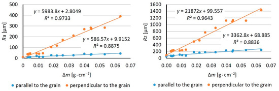 We conclude that the Ra and Rz grew linearly with wood mass loss (Figure 7). At the maximum wood mass loss, the roughness parameter increase in the grain course was several times more than that of the reference value, while perpendicular to the grain, the increase represented even more than one order.