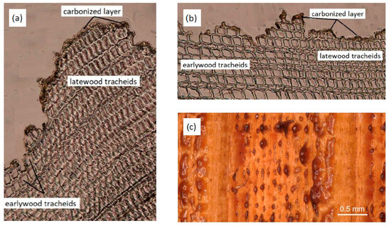 Many early-wood and late-wood tracheids on the engraved spruce wood surface were carbonised. This phenomenon was mostly observed at higher raster densities (20 and 30 mm−1) and at laser power values exceeding 16 W. In the case when the surface layer consisted exclusively of early-wood tracheids, their cell walls were often disturbed due to burn-through by the laser beam, and due to the removal of the very unstable carbonised layer (Figure 8a,b). The radial surfaces also exhibited the occurrence of melted mass, largely due to the resin outflow (Figure 8c). This phenomenon, on the other hand, was more frequent at lower values of raster density and laser power.