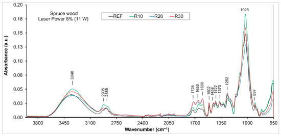 FTIR spectra were examined by applying the ATR technique on the wood surface before and after CO2 laser engraving. The absorption band with a peak at 3350 cm−1 (O−H vibrations in the lignin structure, in hemicelluloses and in cellulose) [16,36], showed apparent variations at all levels of raster density and laser power. Absorbance increase was mainly evident at lower raster densities, while density increase was, contrarily, associated with decreasing absorbance. The reduction of O−H groups was accompanied by condensation of lignin and oxidation to C=O groups [37]. The area from 2950 to 2850 cm−1 (asymmetric and symmetric C−H stretching vibrations in aliphatic compounds) [38] manifested similar patterns. The range from 1800 to 800 cm−1, typical for the stretching and deformation vibrations of all wood components, exhibited more conspicuous variations in the absorbances. The treated samples generally showed increasing absorbance in proximity to 1730 cm−1 (stretching vibrations in unconjugated C=O groups) with increasing raster density of the engraving laser (Figure 9 and Figure 10).