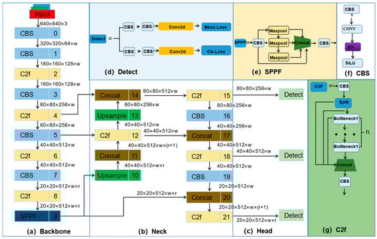 YOLOv8s structure. The w is the width of network and r is the ratio. (a–c) represent the structure of YOLOv8s. (d–g) represent the structure of Detect, SPPF, CBS, and C2f.