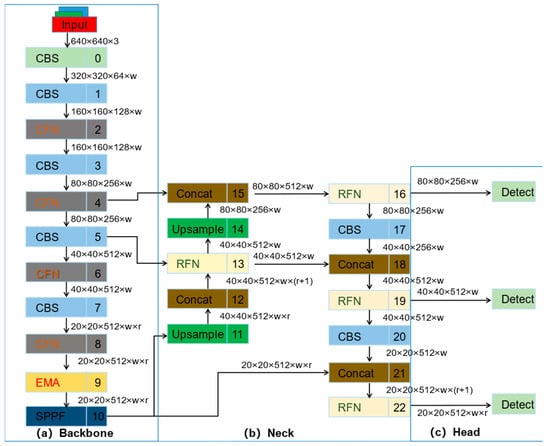 The neck of YOLOv8s is still a continuation of the neck structure in YOLOv5, where the FPN + PAN structure is used to complete the integration of features extracted by the backbone at varying stages to enhance the model’s ability to identify features at varying scales. More and more structures about neck have been proposed to enhance the neck for full integration between multi-scale information, but also increase the computational cost simultaneously. In our study, we opted not to design novel neck modules to circumvent additional connections and fusions among feature pyramids. DAMO-YOLO [] proposed a new EfficientRepGFPN based on GFPN, which significantly improves the accuracy of the model by utilizing various scales of feature maps for different channel dimensions in feature fusion.