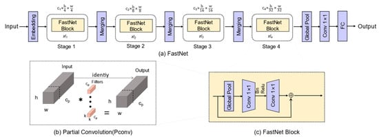 Chen et al. [] proposed a novel convolution PConv, exploiting the redundancy of the feature map to optimize costs. PConv was also utilized in the FasterNet Block and FasterNet. PConv utilizes a standard convolutional operation to extract spatial features from a subset of the input channel while keeping the residual channels. This method has the benefit of reducing computational redundancy and memory access at the same time. The structure of PConv, FasterNet Block, and FasterNet are shown in Figure 3. The FasterNet Block comprises a PConv, 1 × 1 Conv, and 1 × 1 Conv. Formula (5) explains how to calculate the FLOPs of PConv.
