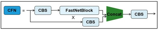 The structure of CFN. CFN is proposed for the first time in this paper, composed of the CBS, FastNet Block, and Concat. The core of CFN is FastNet Block; it can effectively reduce the number of FLOPs and parameters.