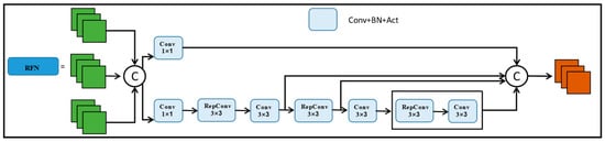 The RFN is illustrated in Figure 5. Input is composed of three layers, and 1 × 1 Conv adjusts the number of channels on two parallel branches after Concat. Multiple Rep 3 × 3 Conv and 3 × 3 Conv form the efficient layer aggregation network (ElAN) []. RepConv is a model re-referencing technique that improves the efficiency and performance of models by merging multiple computational modules into one during the inference phase. ELAN fuses features from different layers by introducing a multi-scale feature fusion module. This can make full use of different levels of semantic information to enhance the ability to demonstrate the model's features. Due to the RFN incorporating RepConv and ELAN, the RFN can achieve much higher precision without bringing an extra computational burden.