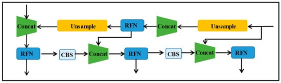 Inspired by RFN, we redesigned the neck in WFRE-YOLOv8s based on the design idea of the DAMO-YOLO network and replaced the C2f with RFN in the neck part of the initial network, which brings the higher accuracy and real-time detection of the whole detection network. The improved neck is shown in Figure 6.