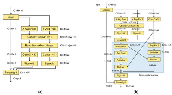 Next, the feature maps of the global perceptual field in both the width and height directions are spliced, and feature transformations are performed using 1 × 1 convolution, batch normalization algorithm, and nonlinear activation. Immediately after that, the feature transformation is achieved by 1 × 1 convolution and Sigmoid activation function so that its dimension is the same as the input X vector, and then the attentional weights gh and gw are computed for the achieved feature maps in the width direction and height direction. Finally, the output gh and gw are combined into a weight matrix by weighted multiplication computation on the original feature maps, and the result is shown in Formula (9). CA is shown in Figure 7a.