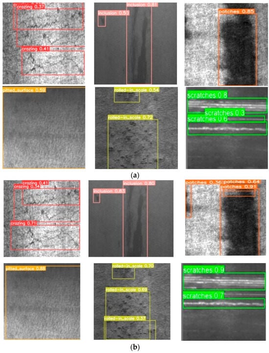 Comparison of detection results on NEU-DET. (a) YOLOv8s recognition effect. (b) Improved recognition of WFRE-YOLOv8s. (a) shows the detection results of YOLOv8s on NEU-DET. (b) shows the detection results of WFRE-YOLOv8s on NEU-DET.