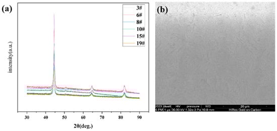 (a) X-ray patterns of six samples; (b) SEM image of the microstructure.