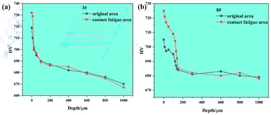 Figure 5 shows the hardness distribution of the contact fatigue area and the original area for typical samples 3# and 8#. For both samples with different damage degrees, it shows a similar change tendency. The hardness value gradually decreases along the depth, and the hardness at the near surface layer increases after contact rolling, which indicates that work hardening occurred on the surface during operation. The relative change in hardness in the contact fatigue area compared to the original area is greater for sample 8# than for sample 3#. Sample 8# underwent greater work hardening than sample 3#, which is consistent with the degree of hardness enhancement shown in Figure 2a.