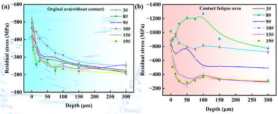 Residual stress distribution along the depth. (a) Original area. (b) Contact fatigue area.