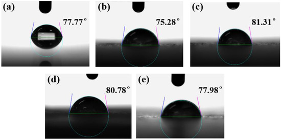 Water contact angle test: (a) Varnish. (b) 10 wt%-MBFs/Polyurethane coating. (c) 20 wt%-MBFs/Polyurethane coating. (d) 30 wt%-MBFs/Polyurethane coating. (e) 40 wt%-MBFs/Polyurethane coating.