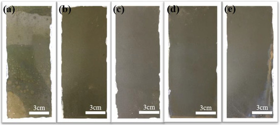 Optical photographs of the coatings. Polyurethane coating (a), coating with 10% MBFs added (b), coating with 20% MBFs added (c), coating with 30% MBFs added (d), coating with 40% MBFs added (e).