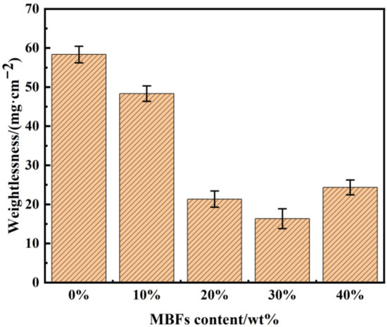 The polymer coatings undergo weight loss behavior during aging degradation due to changes in the polymer chain, and Figure 5 shows the change in the mass of the coating after the 500 h aging test. From the distribution of weight loss data in Figure 5, it can be seen that the higher the content of the MBFs, the lower the loss of coating mass, and it can be assumed that the coating aging degradation behavior is slightly slower. Clear coat has the largest weight loss value, and the weight loss of the coating with the MBFs is significantly reduced, indicating that basalt scales are beneficial to the coating’s weathering performance. The weathering resistance gradually leveled off after the content exceeded 20 wt%, with the least mass loss at 30 wt%, and the increase in mass loss with the addition of 40 wt% of the coating may be due to localized corrosion, with the corrosion products increasing the mass of the specimen.