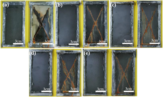 The macroscopic morphology of different coatings after 1000 h of salt spray test is shown in Figure 6. The uncoated part of the substrate of the scribed specimen has already shown obvious corrosion. The coating around the scratch line of the varnish specimen has been partially detached from the substrate, so that a large area of serious corrosion occurs and spreads rapidly, and the coating is completely detached, indicating that the basic protective function of the coating fails. The reason for the detachment during the scribing process is presumed to be the brittleness of the varnish coating and the uniform cohesion produced by polymer cross-linking during the curing process of the resin, while a part of the coating breaks the stress balance caused by the coating detachment from the substrate after the damage occurred. The specimen with basalt scales also showed obvious signs of corrosion, but there was no obvious phenomenon of spreading and peeling, and the surface of the coating had no defects such as blisters, cracks, or pockmarks. The polar end of the resin in the coating can be combined with the active surface of the inorganic flake to generate a cross-linked closed structure, which helps to eliminate the interlayer stress. At the same time, basalt scales evenly dispersed in the coating can be intertwined with the resin polymer chain cross, layer by layer lap to form a partition effect that will be coated into a mesh space, reducing the cohesion generated in the process of resin film, so that the resin deformation is closer to the filler.