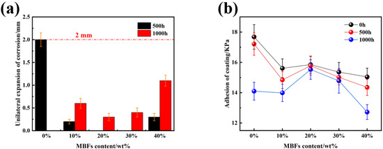 Unilateral spreading behavior tests characterize the rate at which corrosion spreads internally along the coating-substrate interface after a coating has been damaged. Figure 7a shows the results of the salt spray test 500 h and 1000 h unilateral flaring measurements. After 500 h, the varnish coating has been peeled off in a large area, and the unilateral flaring is much more than 2 mm, and the coating has completely failed. The coatings with the 10 wt% and 40 wt% MBFs showed weak corrosion expansion, while the coatings with 20 wt% and 30 wt% MBFs showed no significant corrosion expansion and the periphery of the scribe line remained intact. After 1000 h of the experiment, all the coatings with different degrees of spreading corrosion, in which the amount of spreading corrosion of the coating with the 40 wt% MBFs is more than 1 mm, but less than 2 mm, and it can still effectively play a protective role on the substrate. Adhesion is the most basic requirement for a coating to have corrosion resistance, and it is of great significance to examine the change of wet adhesion during the salt spray test for the anti-corrosion performance of the coating. Figure 7b shows the adhesion of different coatings after 1000 h of salt spray test. According to the test results, it can be seen that during the salt spray test, the varnish coating has the fastest decrease in adhesion due to the lack of corrosion resistance, from the initial 17.68 MPa to 11.1 MPa after 1000 h, with a decrease of 37.16%, which indicates that the varnish coating is affected by the corrosion of salt spray. The decrease in coating adhesion with the addition of the MBFs was also significant, while the decrease in coating adhesion with the addition of the 30 wt% MBFs was the smallest, indicating relatively good corrosion resistance.