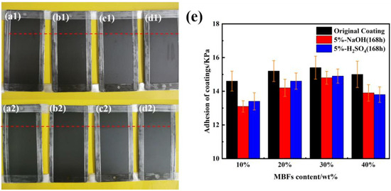 Surface morphology of coatings immersed in the acid-alkali solution for 168 h, (a1,a2) 10 wt%-MBFs/Polyurethane coating. (b1,b2) 20 wt%-MBFs/Polyurethane coating. (c1,c2) 30 wt%-MBFs/Polyurethane coating. (d1,d2) 40 wt%-MBFs/Polyurethane coating. (The red line represents the liquid level demarcation line; below the red line is the test surface.) Adhesion of the coating after 168 h of acid and alkali resistance (e).