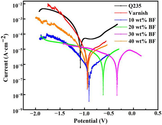 Figure 9 shows the polarization curve of Q235 bare material and different coatings after 7 d immersion in 3.5% NaCl solution. Tafel fitting was used to obtain the corrosion parameters in Table 3. Compared to the Q235, the corrosion current density of the coated specimen was significantly reduced, and the corrosion potential was significantly positively shifted, indicating that the coating can provide effective corrosion protection for the substrate. This is because the organic polymer resin is cured into a film after the structure of a dense, scale-like structure and can play a shielding role, impeding the penetration and erosion of corrosive media. With the increase of basalt flakes content, the corrosion current density of the coating gradually decreases, adding the 20 wt% and 30 wt% MBFs coating corrosion current density is in the order of 10−6, the best protective effect. The annual corrosion rate of the 30 wt% MBFs coating was only 0.076588 mm/year. The corrosion current density of the 20 wt% MBFs coating increased to the order of 10−5, and the protective effect was weakened. Mainly due to basalt flakes over the critical value of uniformly dispersible part of the formation of agglomeration effect, the coating cracks, shrinkage, and other defects, affecting the coating denseness and water absorption.