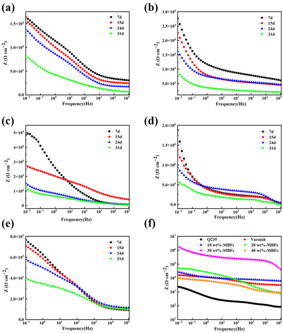 Bode curves for different coatings with different immersion times. (a) Varnish. (b) 10 wt%-MBFs/Polyurethane coating. (c) 20 wt%-MBFs/Polyurethane coating. (d) 30 wt%-MBFs/Polyurethane coating. (e) 40 wt%-MBFs/Polyurethane coating. (f) Impedance curves of different specimens immersed for 7 days.