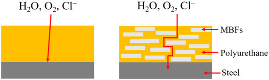Figure 11 is a diagram of the mechanism of adding basalt flakes. Basalt flakes are an inorganic material whose lamellar structure in the coating can be lapped to form a “lap interlocking—labyrinth” effect, increasing the corrosive media penetrating through the coating to contact the substrate path, playing a good shielding effect [37], thus effectively slowing down the process of corrosion and improve the service life of the coating. At the same time, the formation of the lap network can be divided into several small independent spaces within the coating grid, the more the content of filler, the physical and chemical properties of the coating closer to the filler’s own properties, effectively reducing the coating in the process of curing the film produced by the contraction or expansion of stress on the performance of the coating.