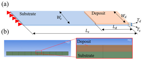 (2) Mesh division. Automatic meshing with ANSYS software (v19.2) is difficult because the substrate’s and deposit’s thickness differ by an order of magnitude. Multizone and Mapped Mesh Types were used for hexahedral meshing to improve the simulation accuracy of the stress distribution of the substrate and deposit. The element sizes in the thickness direction of the substrate and the deposit were 50 μm and 2 μm, respectively. The figure after meshing of the model is shown in Figure 1b.