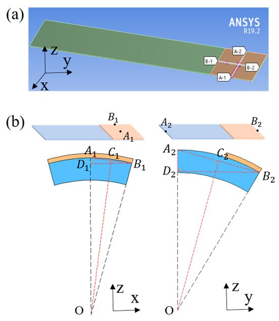 To obtain the curvature radius and stress of the deposit in different directions, extraction paths were set within the deposit during data post-processing, as shown in Figure 3a. Lines A-1 to A-2 and B-1 to B-2 represent the x and y directions, respectively. We calculated the radius of curvature after deformation, referring to the method reported by Hsi-Chao Chen et al. [19], as shown in Figure 3b. For the x-direction, we extracted the displacements of points and in the x- and z-directions in the xoz plane; is the displacement difference at the point in the z-direction before and after deformation and is the displacement difference of point in the x-direction before and after deformation. The same process is also applied for the y-direction, and the marker is identified by the subscript with 2, such as A2, B2, C2, and D2. Two similar right triangles ( and ) were constructed, and the radius of curvature was obtained as