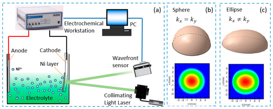 We used a self-developed electrodeposition system for stress measurement with high accuracy, consisting of a Quadri-wave Lateral Shear Wavefront Sensor (SID4-HR, Phasics@ Corp., Saint-Aubin, France), Collimating Light Source (R-cube, Phasics@ Corp., Saint-Aubin, France), Electrochemical Workstation (CHI600E, Shanghai Chinstruments@ Corp., Shanghai, China), and a Haring Cell. A schematic of the measurement apparatus is shown in Figure 4a. The laser (λ = 532 nm) sequentially passed through the transparent electrodeposition cell, electrolyte, and substrate. The reflection was generated in the interface between the deposit and the substrate, and the reflected light was detected by the wavefront sensor. The curvature of the substrate was measured in situ by the principle of transverse shearing interference [7]. The internal stress of the deposit can be calculated from the curvature of the substrate. The wavefront sensor can also obtain the phase map of the wavefront, which can directly reflect the surface topography of the sample. When the deformation of the sample surface is a spherical shape, the resulting wavefront phase map is circular, as shown in Figure 4b; when the deformation of the sample surface is an ellipsoid, the map shows an ellipse shape, as shown in Figure 4c. Therefore, the surface deformation of the sample can be directly reflected by the wavefront phase map, indicating whether there is a nonlinear effect in the measurement process or not.
