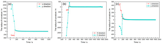 The curvature radius as a function of time with different directions. The widths of the substrates were (a) 15 mm, (b) 10 mm, and (c) 5 mm, respectively.
