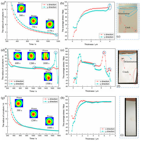 Interestingly, when the substrate width is reduced to 5 mm, as shown in Figure 6g,h, one can see that the values of the curvature radii and stresses in the x- and y-directions are close to the same. Moreover, there are no obvious defects on the surface of the deposit (Figure 6i), and the phase map is close to a circle (see inset in Figure 6g), indicating that the surface deformation of the deposit in different directions is consistent and the surface curvature is uniform.