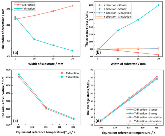 Curvature radius and stress of the deposit in the simulation. (a) The radius of curvature as a function of substrate width for x and y directions; (b) The average stress plotted as a function of substrate width for Stoney’s formula calculation and simulation ( was 325.15 K). (c) The radius of curvature as a function of equivalent reference temperature () for x and y directions. (d) The average stress as a function of for calculation using Stoney’s formula and simulation (The substrate width is 5 mm).