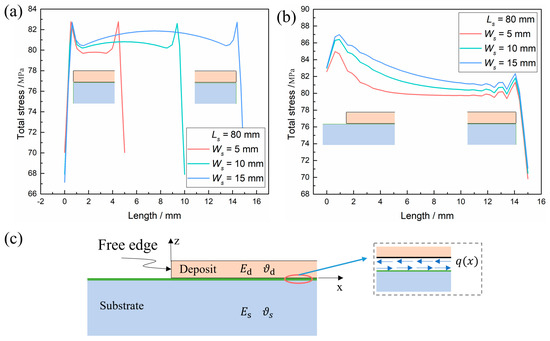 Total stress on different substrate sizes for (a) the x-direction and (b) the y-direction; and (c) schematic of a deposit–substrate system with a free edge. The enlarged figure shows the distribution of the interfacial shear stress ().