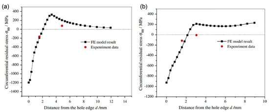 (a) Tangential residual stress distribution around the CE hole in the X–direction (b) Tangential residual stress distribution around the CE hole in the Y–direction [48].